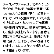| このプロジェクトでは、付近まで来ていた電気を施設内に通すための備品購入と、宿泊施設の工事を行ないました。今までは夜の明かりや、水のくみ上げに自家発電を頼っていました。しかし、3日で200バーツもかかるため、いつも電気を使えるわけではありませんでした。このプロジェクトによって、いつでも水を汲むことが出来、冷蔵庫を使えるようになりました。日が暮れてからの会議も可能になり、扇風機も使えます。また、電気が来たことと、宿泊施設が完備されたことで、政府の視察団や海外のNGOの受け入れが可能になりました。これは、メーコックファームの活動を理解し、たくさんの方々に協力を頂く上で大事な役割を果たしています。 |