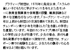 | 「生き直しの学校」建設は、虐待や売春・麻薬などで傷ついた少女たちと、幼い子どもたちを救う為、プラティープ財団の20周年記念事業として計画されました。取り組みの趣旨に賛同した「コープクン・マーク」は、同プロジェクトに100万円の支援を行ないました。冷蔵庫、浄水器、ガスレンジ、棚、食器などの台所用品が購入され、施設内での生活に役立てられています。学校には、麻薬から更生する子、家庭崩壊の犠牲になった子、身体的虐待・性的虐待を受けた子、ストリートチルドレン、両親が麻薬の罪で刑務所にいる子などさまざまな境遇の子どもたちが受け入れられています。子どもたちは、ここで一般教育と職業訓練の機会を与えられます。 |