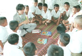 ![]() アジアこども教育センターでは、車に図書を積んで東北タイをはじめとする山岳民族の小学校を訪ね、学校と共同で「移動寺子屋教室」プログラムを行っています。貧しい村の小学校には教科書以外の図書がないところも多く、子供たちは毎年やってくる移動寺子屋教室を楽しみにしています。プログラムでは、ゲームを通して本の扱い方や本を読むことの大切さを子供たちに伝え、タイ人スタッフが実際に子供たちに本の朗読を行います。コープクン・マークは、スタディツアーを通じてアジアこども教育センターとの交流を続け、実際に移動寺子屋教室に同行させて頂きました。その活動に賛同し、毎年運営資金の支援を行ってきました。 |